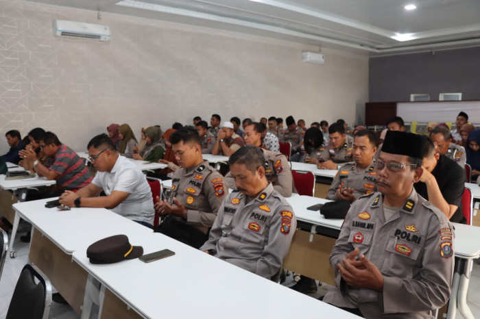 BATU BARA | TEMPO TIMUR – Personel Polri Kepolisian Resort (Polres) Batu Bara Doa Bersama Lintas Agama dalam Rangka Hari Bhayangkara Ke – 77 Tahun 2023 di Gedung Bhayangkari Wira Satya, Jumat (16/06/2023).