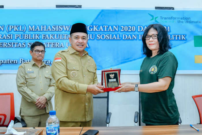 Selanjutnya Bupati Zahir bersama dosen pembimbing melakukan serah terima peserta KKN FISIP USU kepada Pemerintah Kabupaten Batu Bara yang ditandai dengan saling bertukar cinderamata. (Ham)