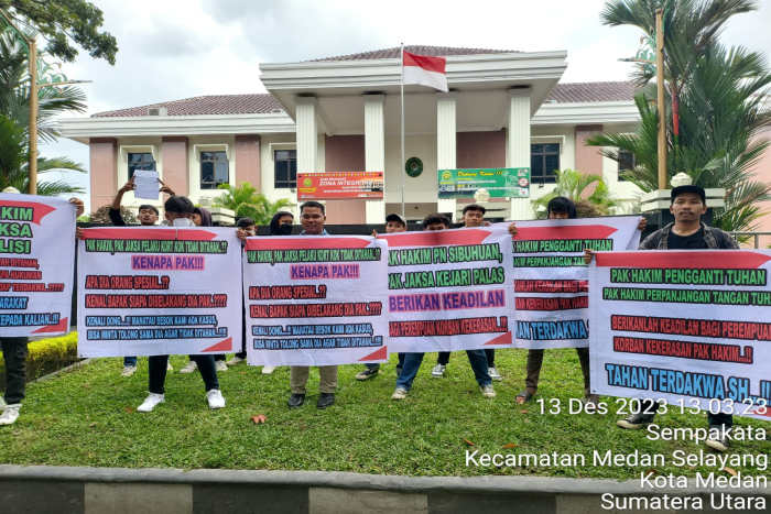 Setelah melakukan aksi di Kejati Sumut, puluhan massa melanjutkan aksinya di depan Kantor Pengadilan Tinggi (PT) Medan. Disitu para massa menuntut agar hakim PN Sibuhuan melakukan penahanan terhadap terdakwa SH.