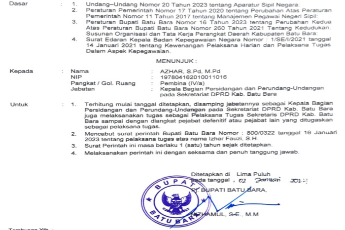 Dalam surat ini disebutkan, bahwa sehubungan dengan kekosongan jabatan Sekretaris DPRD Kabupaten Batu Bara dan untuk terlaksananya seluruh tugas-tugas kedinasan perlu menugaskan Pelaksana Tugas.