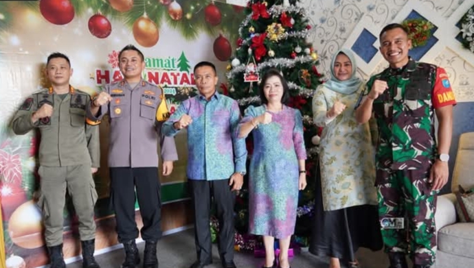Penjabat (Pj) Bupati Murung Raya, Dr. Hermon bersama dengan Istri, Melsie Hermon menyambut kedatangan masyarakat yang hadir dalam open house Perayaan Natal tersebut.