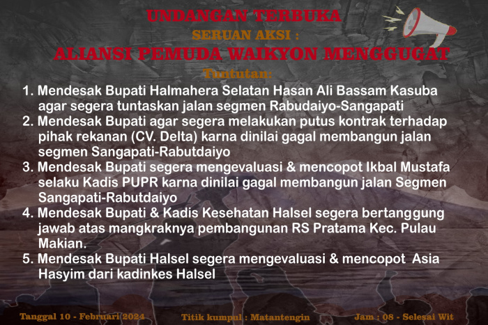 “Tujuan penolakan kami terhadap Bassam Kasuba di pulau makian ini agar segera mencopot Kepala Dinas Kesehatan Asia Hasyim dan Kepala Dinas PUPR, Ikbal Mustafa karena gagal dalam melaksanakan tugas dan tanggungjawab” Kata salah satu aktifitas Maluku Utara asal makian itu.
