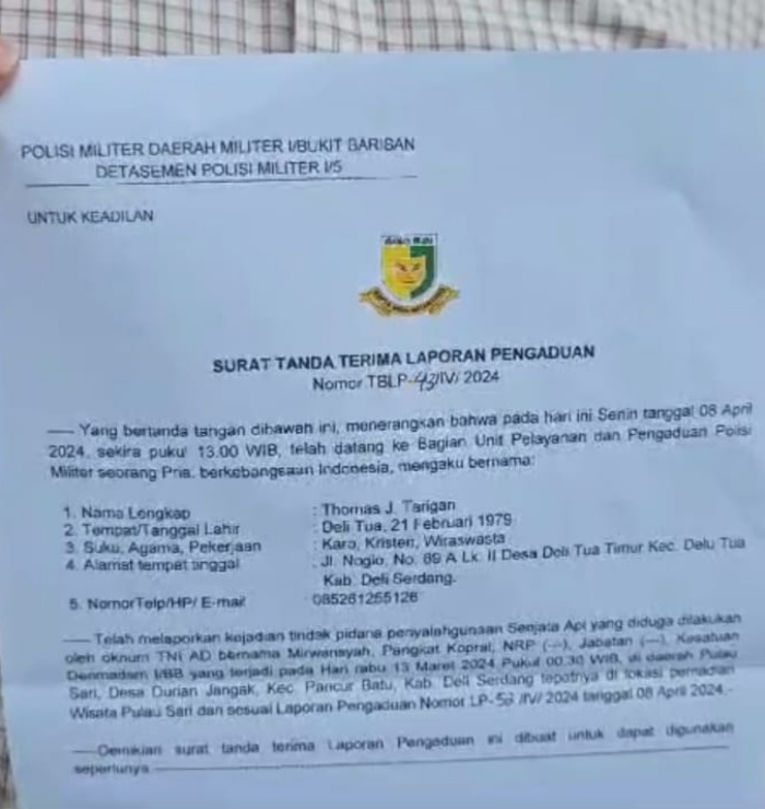 Pengaduan dilayangkan oleh kuasa hukum ini ke Denpom I Medan, Jalan Letjen Suprapto Medan, Senin (8/4/2024) siang sesuai dengan nomor laporan (LP) 52/IV/2024.