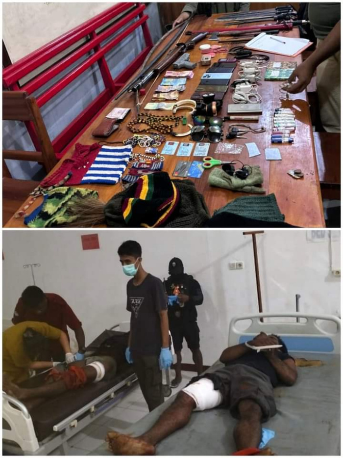 “Kami juga mengamankan sejumlah barang bukti di TKP penindakan antara lain 5 buah parang, 1 pucuk senapan angin, 2 buah busur panah, 1 bilah pisau dengan gagang berwarna merah, 1 bilah samurai dengan sarung terbuat dari kayu berwarna merah, 1 bilah pisau dan HP berbagi jenis serta aksesoris lainya yang bermotif Bintang Kejora,” jelas Bayu.