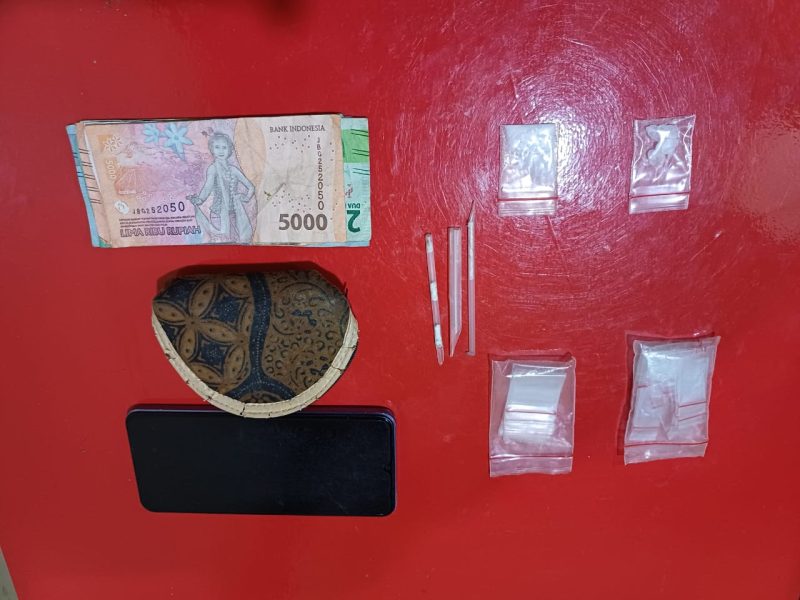 Kemudian unit opsnal melakukan penangkapan dan penggeledahan badan dan tempat sekitar dan di temukan 2 (dua) buah plastik klip sedang berisikan kristaI di duga sabu. 1 (satu) buah dompet warna coklat , 2 (dua) buah plastik klip kosong, satu unit hp dan uang tunai seratus lima puluh ribu rupiah.