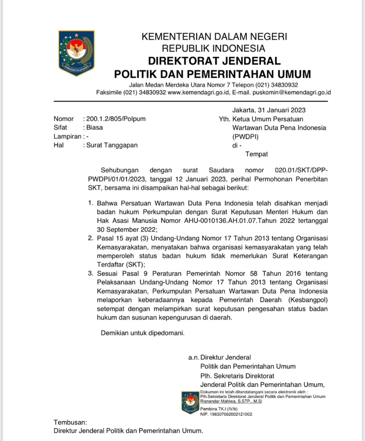 Dalam surat keputusan yang baru saja diterbitkan, Kemendagri secara resmi menyatakan bahwa badan hukum PWDPI telah sah dan diakui. Hal ini memberikan legitimasi penuh bagi PWDPI untuk beroperasi sebagai organisasi profesi wartawan di Indonesia. Sebagai konsekuensi dari pengakuan ini, PWDPI kini diharuskan untuk mendaftarkan organisasinya ke Badan Kesatuan Bangsa dan Politik (Kesbangpol) di seluruh provinsi di Indonesia.