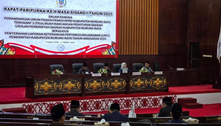 Murung Raya, tempotimur.com – DPRD Kabupaten Murung Raya (Mura) menggelar rapat paripurna ke 4 masa sidang I Tahun 2025 dalam rangka mendengarkan pemandangan fraksi-fraksi DPRD, dan 3 buah Rancangan Peraturan Daerah (Raperda) usulan Pemerintah Daerah Kabupaten Murung Raya sekaligus penyerahan laporan keterangan Pertanggungjawabanan (LKPJ) Pemerintah Kabupaten Murung Raya Tahun Anggaran 2024.