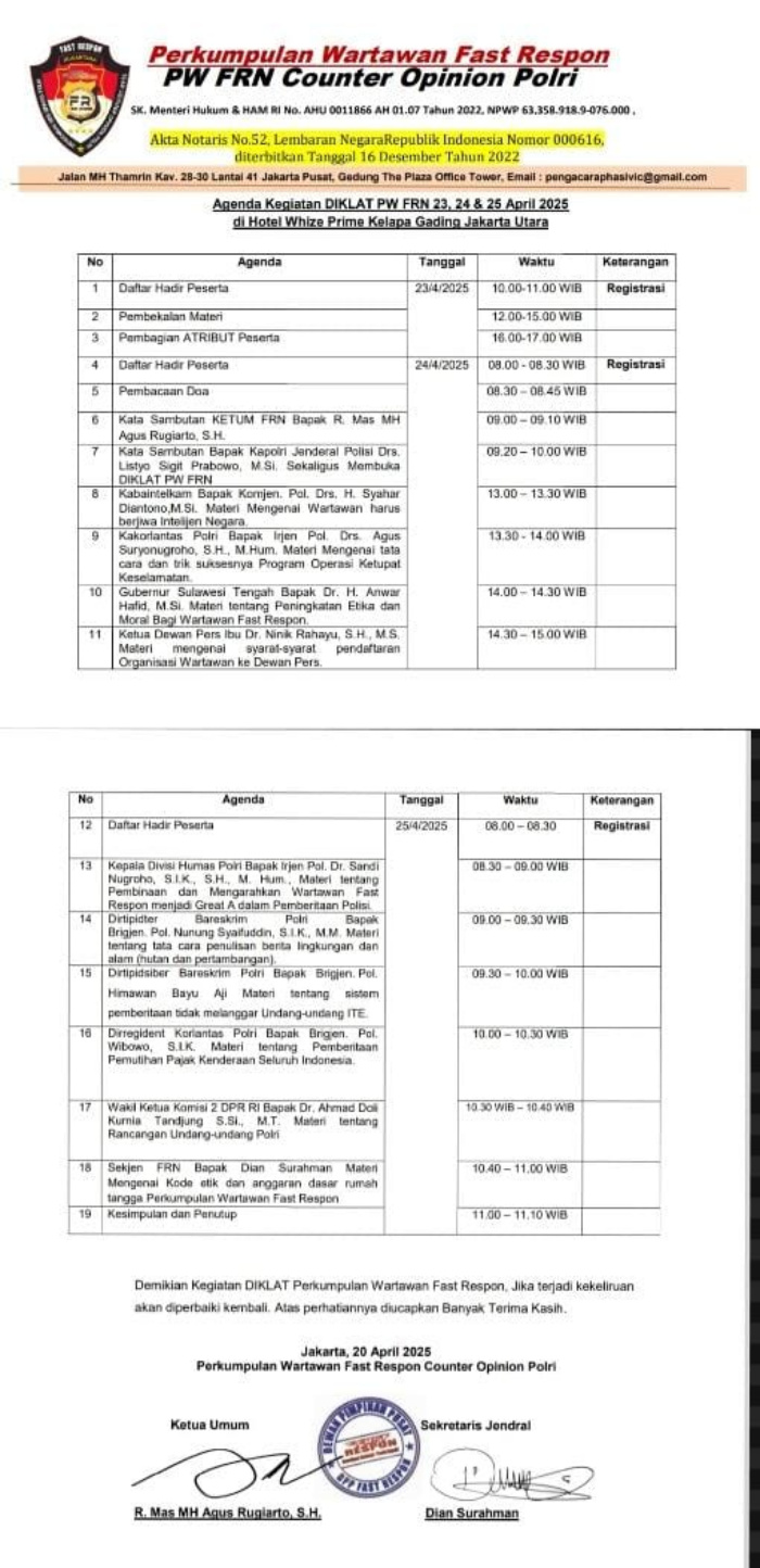 ” Yang Full Dukung Acara Diklat Kali ini Pak Menteri Imipas , dan Sebagian Para Jendral agar Sukses Acara ini, ” Demikian Penyampaian Ketua Umum R.Mas MH Agus Rugiarto SH, didampingi Sekjen Perkumpulan Wartawan Fast Respon (PW FRN ) Dian Surahman, saat Jumpa Pers di Hotel Whize Prime Kelapa Gading Jakarta Pusat, Selasa (22/4).