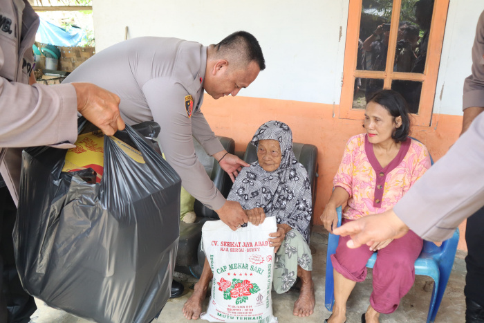 Batu Bara — Kapolres Batu Bara AKBP Doly Nelson H. H. Nainggolan, S. H., M.H, bersama Personil Polres Batu Bara dan Polsek Lima Puluh bagikan paket sembako kepada Kaum Dhuafa dan Lansia di Desa Sumber Padi Kecamatan Lima Puluh Kabupaten Baru Bara, Jumat 23/5/2025.
