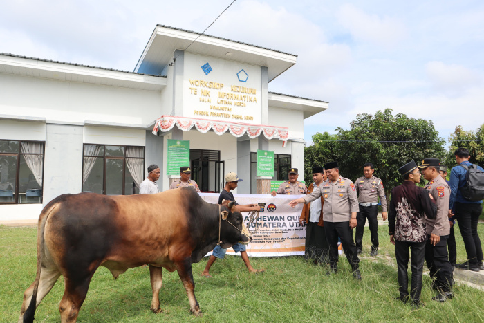 Batu Bara — Kapolres Batu Bara AKBP Doly Nelson H.H Nainggolan menyerahkan Hewan Qurban dari Kapolda Sumut kepada Pimpinan Yayasan Pendidikan Pondok Pesantren Jabal Hindi, Jl. Hidayah Dusun Tuan H. Bakri Desa Masjid Lama Kecamatan Talawi Kabupaten Batu Bara, Kamis 5/6/2025.