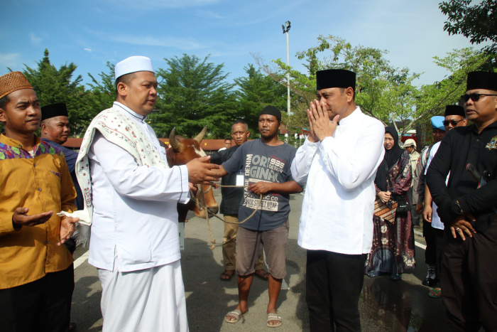Selepas Salat Ied, Kapolda memimpin langsung penyerahan hewan kurban dalam rangka Idul Adha 1446 H di halaman Masjid An-Nur, Mapolda Kalbar.