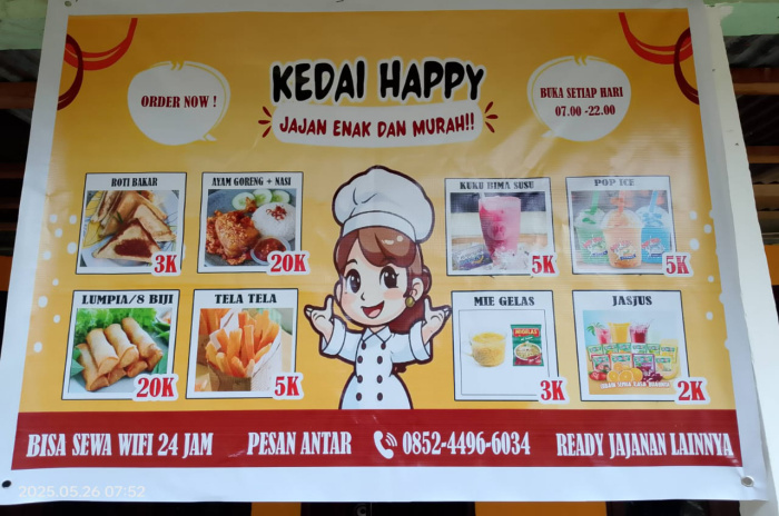 Kini, Kedai Happy tidak hanya menyediakan makanan ringan, tetapi juga berbagai menu pilihan yang digemari kalangan pelajar, mahasiswa, hingga karyawan. Lokasinya yang strategis di Jalan Misi, kampung lusiferi Fakfak, juga menjadi nilai tambah tersendiri.