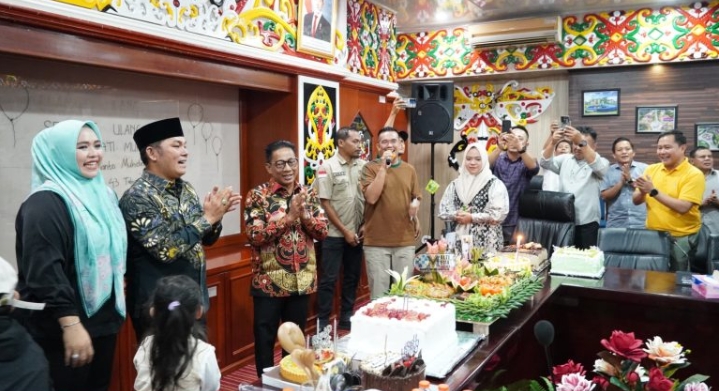 PURUK CAHU, tempotimur.com – Suasana penuh kekeluargaan dan penuh kehangatan mewarnai di aula A kantor Bupati Murung Raya, Jumat (14/6/2025), saat Bupati Murung Raya, Heriyus dan istri Wakil Bupati, Dina Maulidah, jajaran kepala perangkat daerah serta sejumlah ASN di lingkup Pemkab Murung Raya memberikan kejutan ulang tahun Wakil Bupati, Rahmanto Muhidin, yang genap berusia 43 tahun.