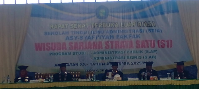 Fakfak — Sekolah Tinggi Ilmu Administrasi (STIA) Asy-Syafi’iyah Fakfak melaksanakan Wisuda ke-20 bagi lulusan Program Studi Administrasi Publik dan Administrasi Bisnis Tahun Akademik 2025/2026 pada Kamis, 26 Mei 2025. Prosesi berlangsung khidmat dan penuh haru di Lapangan Basket Gedung KONI, Jalan D.I. Panjaitan, Distrik Fakfak Utara, Kabupaten Fakfak, Papua Barat.