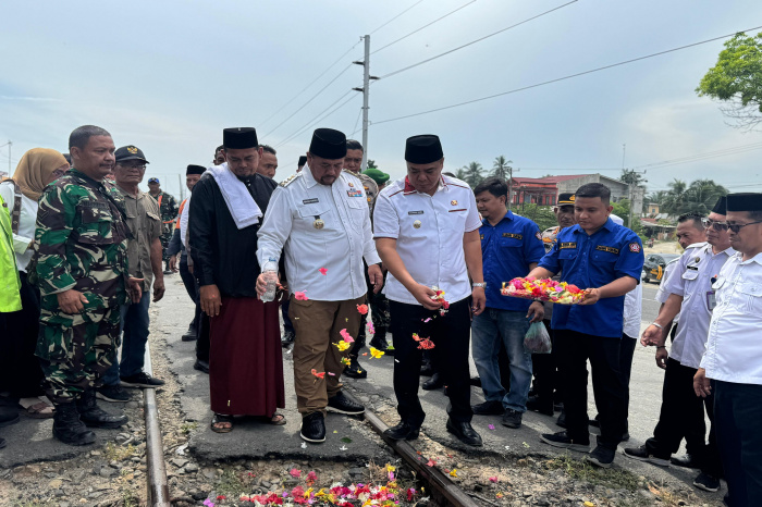 Batu Bara — Bupati Batu Bara H Baharuddin Siagian SH, M.Si. didampingi Wakil Bupati Syafrizal, SE, M.Ap, dan Kasat Lantas AKP Agnis Juwita, S.I.K. berzikir dan berdoa bersama di Perlintasan Kereta Api Desa Lalang Kecamatan Medang Deras Kabupaten Batu Bara,Rabu 2/7/2025.