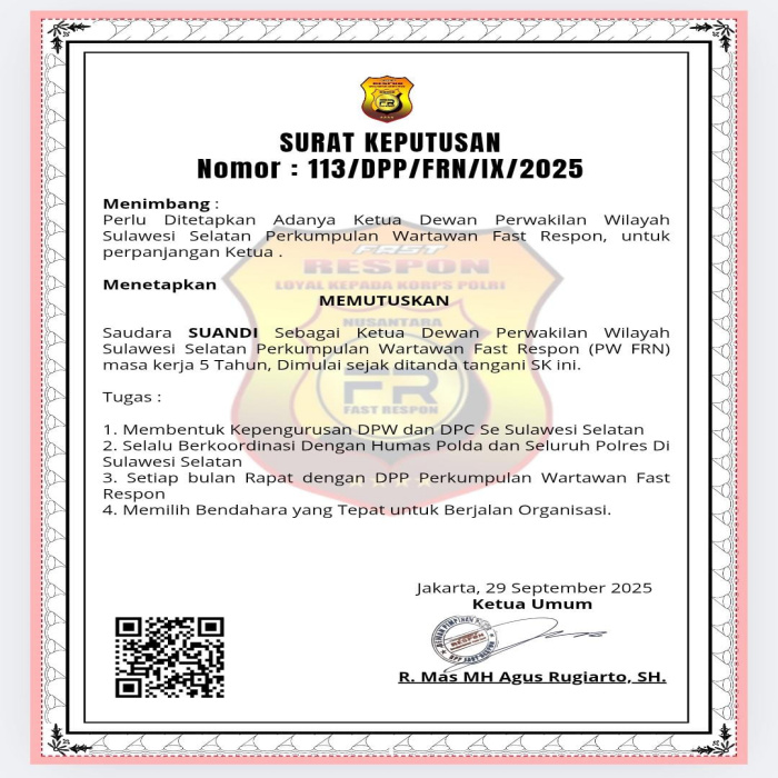 Jakarta — Dewan Pimpinan Pusat (DPP) Perkumpulan Wartawan Fast Respon (PW FRN) secara resmi menetapkan Suandi sebagai Ketua Dewan Perwakilan Wilayah (DPW) PW FRN Sulawesi Selatan, Senin 29/9/2025.