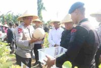 Sidoarjo — Satuan Brimob Polda Jawa Timur menggelar panen raya melon dan semangka di Kesatrian Guruh Arif Darmawan, Mako Kompi 4 Yon…