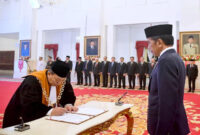 Jakarta – Wakil Ketua Mahkamah Agung (MA) Bidang Non Yudisial, Suharto mengucapkan sumpah yang disaksikan langsung Presiden Joko Widodo di Istana Negara, Jakarta, Rabu…